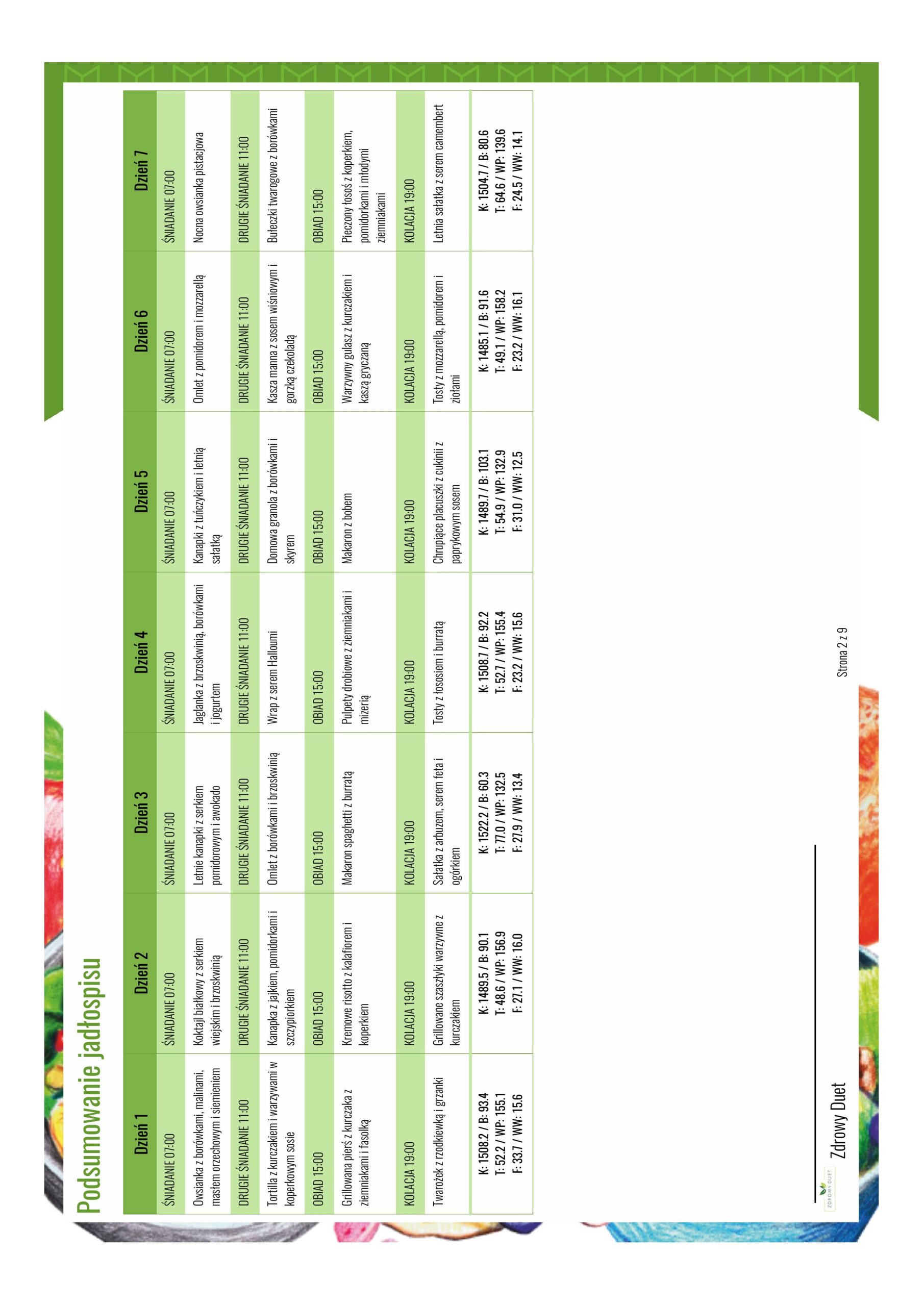 Obok każdego posiłku oraz w podsumowaniu każdego dnia z diety są podane wartości, np. K (kalorie):368.9 / B (białko): 18.9 / T (tłuszcz): 8.5 / WP (węglowodany przyswajalne): 48.0 / F (błonnik): 13.3 / WW (wymienniki węglowodanowe): 4.9.